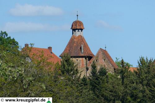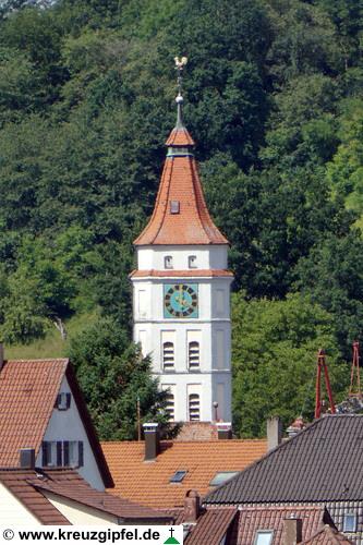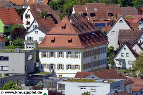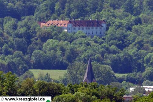 Schloss Filseck hinter dem Turm der Faurndauer Stiftskirche