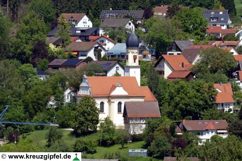 Friedhofskapelle und Aussegnungshalle, dahinter der Kirchturm von Oberwälden